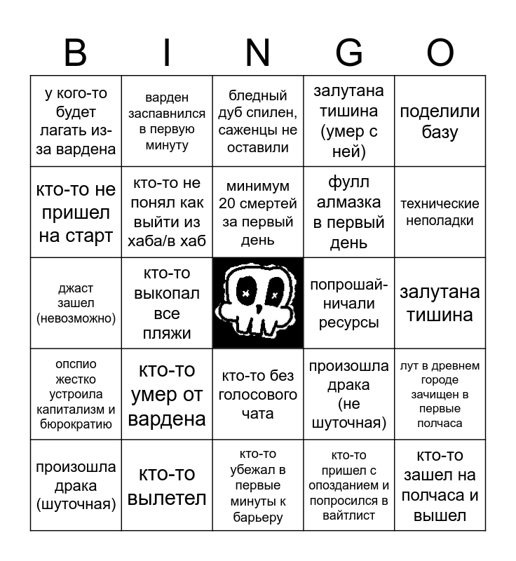 This bingo card has a free space and 24 words: кто-то умер от вардена, кто-то вылетел, минимум 20 смертей за первый день, произошла драка (шуточная), поделили базу, у кого-то будет лагать из-за вардена, кто-то не пришел на старт, варден заспавнился в первую минуту, попрошай-ничали ресурсы, кто-то без голосового чата, фулл алмазка в первый день, джаст зашел (невозможно), произошла драка (не шуточная), лут в древнем городе зачищен в первые полчаса, кто-то не понял как выйти из хаба/в хаб, кто-то пришел с опозданием и попросился в вайтлист, залутана тишина, бледный дуб спилен, саженцы не оставили, технические неполадки, кто-то выкопал все пляжи, кто-то зашел на полчаса и вышел, опспио жестко устроила капитализм и бюрократию, залутана тишина (умер с ней) and кто-то убежал в первые минуты к барьеру.