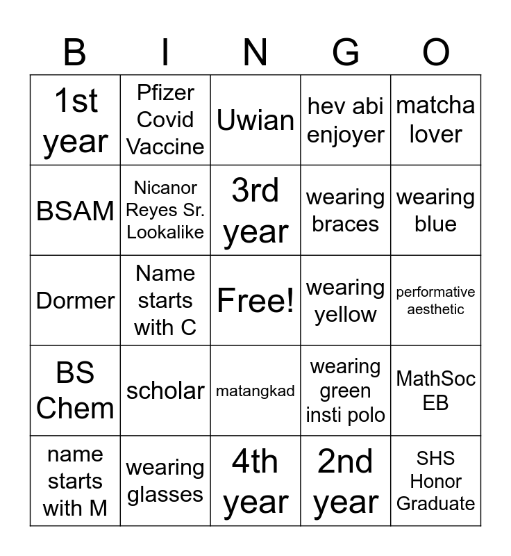 This bingo card has a free space and 24 words: scholar, wearing glasses, 3rd year, name starts with M, matcha lover, 1st year, BSAM, Pfizer Covid Vaccine, wearing yellow, matangkad, wearing braces, Dormer, wearing green insti polo, MathSoc EB, Nicanor Reyes Sr. Lookalike, 2nd year, performative aesthetic, Uwian, wearing blue, Name starts with C, SHS Honor Graduate, BS Chem, hev abi enjoyer and 4th year.