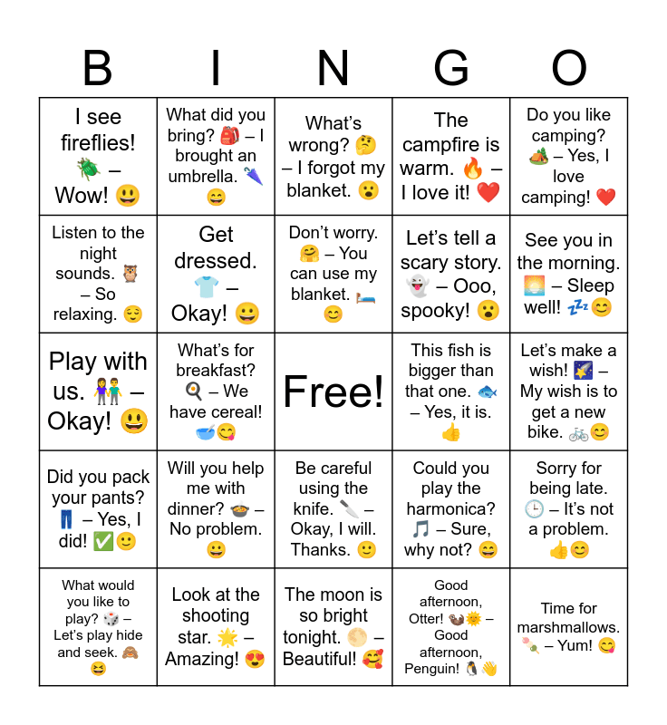 This bingo card has a free space and 32 words: Good afternoon, Otter! ๐ฆฆ๐ โ Good afternoon, Penguin! ๐ง๐, Itโs Saturday! ๐ โ Oh, itโs camping day! โบ๐, Whatโs for breakfast? ๐ณ โ We have cereal! ๐ฅฃ๐, Whatโs the weather like today? ๐ค โ Itโs sunny! ๐โ๏ธ, Did you pack your pants? ๐ โ Yes, I did! โ ๐, Get dressed. ๐ โ Okay! ๐, Do you like camping? ๐ โ Yes, I love camping! โค๏ธ, Sorry for being late. ๐ โ Itโs not a problem. ๐๐, What did you bring? ๐ โ I brought an umbrella. ๐๐, Weโre here! ๐ โ Hooray! ๐, Donโt worry. ๐ค โ You can use my blanket. ๐๐, Whatโs wrong? ๐ค โ I forgot my blanket. ๐ฎ, Where are we going? ๐งญ โ Weโre going to the river. ๐, Letโs go fishing. ๐ฃ โ Sounds great! ๐, This fish is bigger than that one. ๐ โ Yes, it is. ๐, I caught one! ๐ฃ โ I caught one too! ๐, What would you like to play? ๐ฒ โ Letโs play hide and seek. ๐๐, Play with us. ๐ซ โ Okay! ๐, Be careful using the knife. ๐ช โ Okay, I will. Thanks. ๐, Will you help me with dinner? ๐ฒ โ No problem. ๐, Could you play the harmonica? ๐ต โ Sure, why not? ๐, Are you excited? ๐คฉ โ Yes, I am! ๐, Letโs make a wish! ๐ โ My wish is to get a new bike. ๐ฒ๐, Look at the shooting star. ๐ โ Amazing! ๐, Time for marshmallows. ๐ก โ Yum! ๐, The campfire is warm. ๐ฅ โ I love it! โค๏ธ, Letโs tell a scary story. ๐ป โ Ooo, spooky! ๐ฎ, Listen to the night sounds. ๐ฆ โ So relaxing. ๐, I see fireflies! ๐ชฒ โ Wow! ๐, The moon is so bright tonight. ๐ โ Beautiful! ๐ฅฐ, Itโs bedtime now. ๐ด โ Goodnight, friends. ๐๐ค and See you in the morning. ๐ โ Sleep well! ๐ค๐.