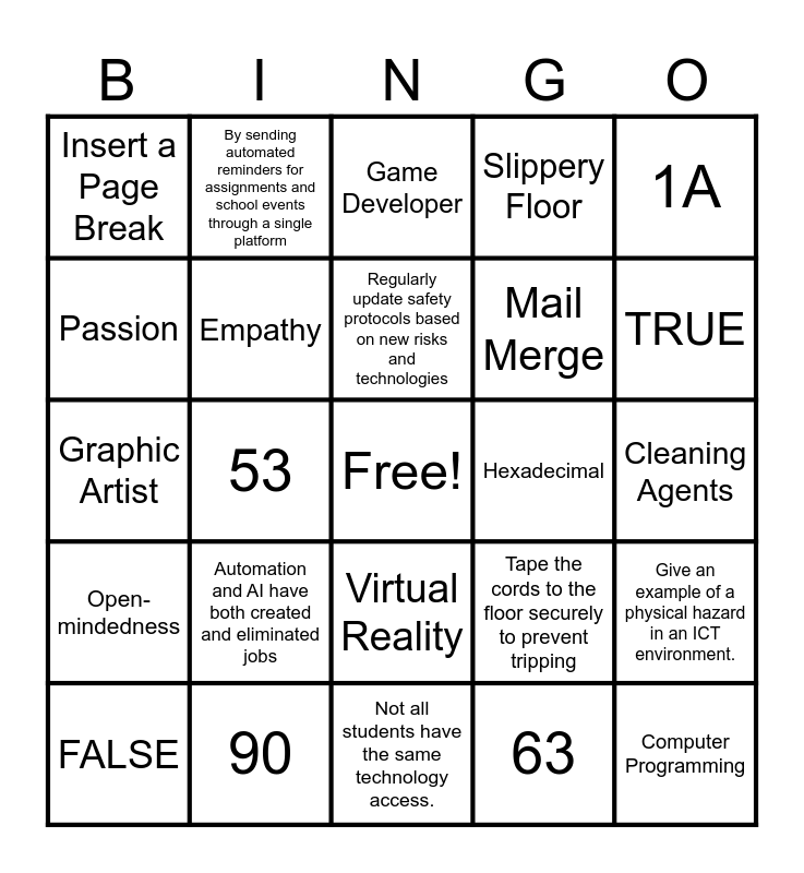 This bingo card has a free space and 46 words: An animator, Computer Programming, Illustrator, Not all students have the same technology access., Automation and AI have both created and eliminated jobs, A simple design that helps users find what they need fast., By sending automated reminders for assignments and school events through a single platform, By merging IoT and digital technologies for advanced medical care, Passion, Knowledge, Empathy, Slippery Floor, Give an example of a physical hazard in an ICT environment., Tape the cords to the floor securely to prevent tripping, Move the computers farther apart to improve airflow and prevent overheating, Regularly update safety protocols based on new risks and technologies, Regularly update safety protocols based on new risks and technologies, Hexadecimal, 13, 1A, 53, 63, Insert a Page Break, Mail Merge, Right Click and Update, TRUE, FALSE, CSS, Virtual Reality, Open-mindedness, Hexadecimal, 1000, 100, 35, 50, 90, Cleaning Agents, Seiri, Octal, Decimal, Risk-taker, Game Developer, Graphic Artist, References, Bibliography and Citation.