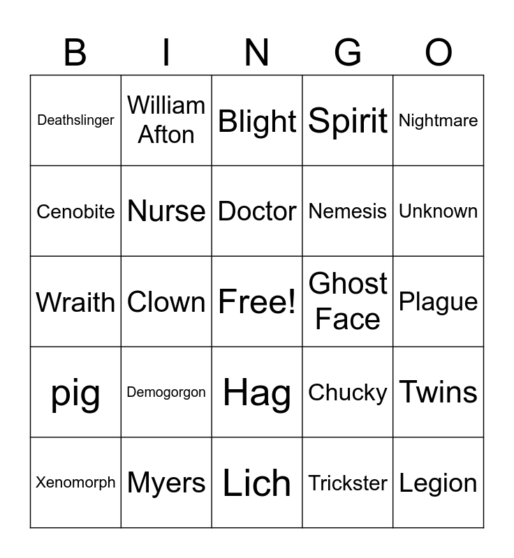 This bingo card has a free space and 40 words: Trapper, Wraith, Hillbilly/Cannibal, Nurse, Myers, Hag, Doctor, Huntress, Nightmare, pig, Clown, Spirit, Legion, Plague, Ghost Face, Demogorgon, Oni, Deathslinger, Pyramid Head, Blight, Twins, Trickster, Nemesis, Cenobite, Artist, Onryō, Dredge, Mastermind, Knight, Skull Merchant, Singularity, Xenomorph, Unknown, Chucky, Unknown, Lich, Houndmaster, Ghoul, William Afton and Dracula.