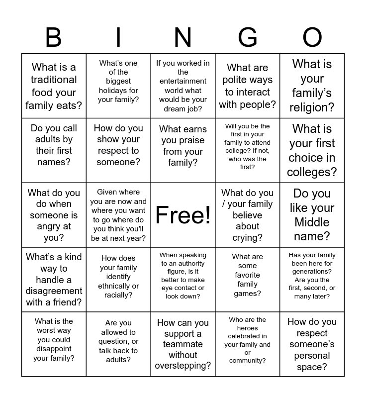 This bingo card has a free space and 24 words: How does your family identify ethnically or racially?, Are you allowed to question, or talk back to adults?, What earns you praise from your family?, What is the worst way you could disappoint your family?, What is your family’s religion?, What is a traditional food your family eats?, Do you call adults by their first names?, What’s one of the biggest holidays for your family?, What do you / your family believe about crying?, When speaking to an authority figure, is it better to make eye contact or look down?, Will you be the first in your family to attend college? If not, who was the first?, What do you do when someone is angry at you?, What are some favorite family games?, Has your family been here for generations? Are you the first, second, or many later?, How do you show your respect to someone?, Who are the heroes celebrated in your family and or community?, Do you like your Middle name?, If you worked in the entertainment world what would be your dream job?, What is your first choice in colleges?, Given where you are now and where you want to go where do you think you'll be at next year?, How do you respect someone’s personal space?, What’s a kind way to handle a disagreement with a friend?, What are polite ways to interact with people? and How can you support a teammate without overstepping?.