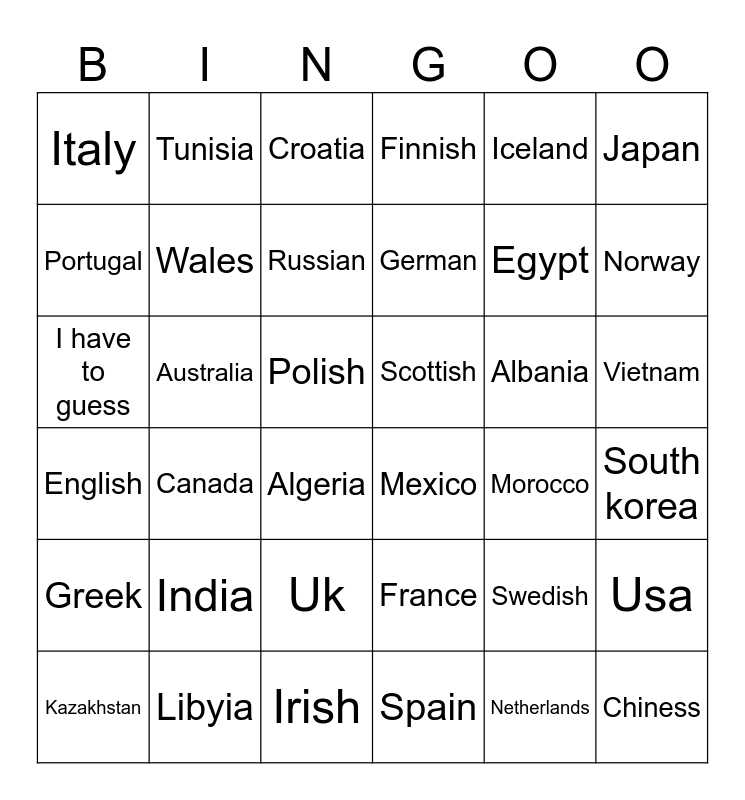 This bingo card has 36 words: France, Uk, Spain, Portugal, English, Scottish, Wales, Irish, Iceland, Swedish, Norway, Finnish, Usa, Australia, German, Italy, Greek, Albania, I have to guess, Croatia, Polish, Canada, Mexico, Algeria, Morocco, Tunisia, Egypt, Libyia, Russian, Japan, Chiness, Kazakhstan, South korea, Vietnam, India and Netherlands.