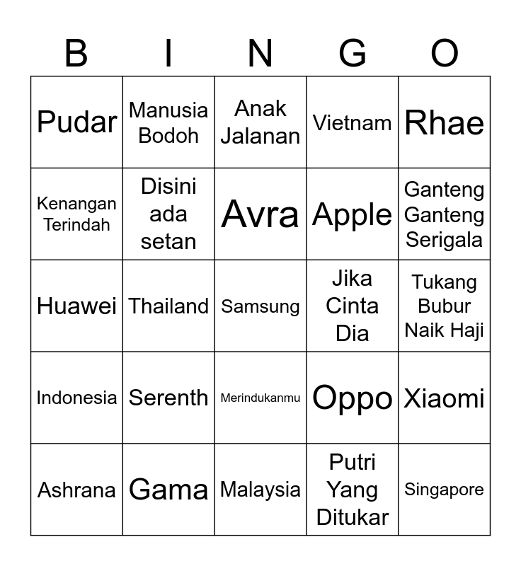 This bingo card has a free space and 24 words: Serenth, Gama, Avra, Ashrana, Rhae, Pudar, Kenangan Terindah, Manusia Bodoh, Jika Cinta Dia, Merindukanmu, Apple, Huawei, Oppo, Xiaomi, Disini ada setan, Putri Yang Ditukar, Tukang Bubur Naik Haji, Anak Jalanan, Ganteng Ganteng Serigala, Thailand, Singapore, Indonesia, Vietnam and Malaysia.