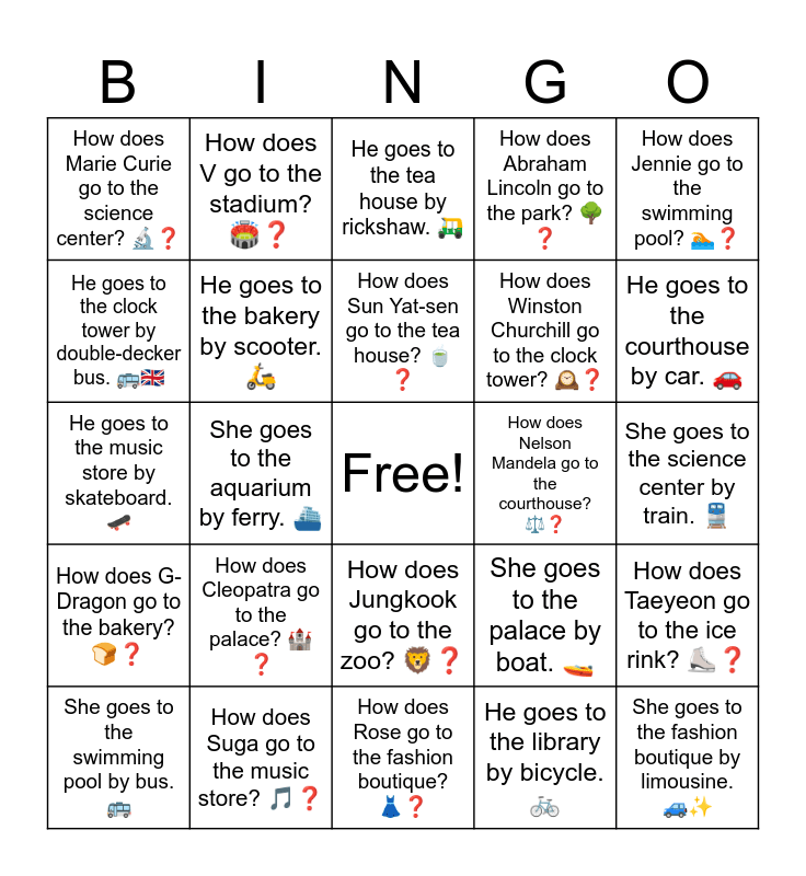 This bingo card has a free space and 34 words: How does Jimin go to the library? πβ, He goes to the library by bicycle. π², How does IU go to the art museum? π¨β, She goes to the art museum by taxi. π, How does G-Dragon go to the bakery? πβ, He goes to the bakery by scooter. π΅, How does Jennie go to the swimming pool? πβ, She goes to the swimming pool by bus. π, How does V go to the stadium? πβ, He goes to the stadium by subway. π, How does Sun Yat-sen go to the tea house? π΅β, He goes to the tea house by rickshaw. πΊ, How does Lisa go to the flower market? πΈβ, She goes to the flower market by motorcycle. π, How does Nelson Mandela go to the courthouse? βοΈβ, He goes to the courthouse by car. π, How does Suga go to the music store? π΅β, He goes to the music store by skateboard. πΉ, How does Cleopatra go to the palace? π°β, She goes to the palace by boat. π€, How does Jungkook go to the zoo? π¦β, He goes to the zoo by tram. π, How does Marie Curie go to the science center? π¬β, She goes to the science center by train. π, How does Rose go to the fashion boutique? πβ, She goes to the fashion boutique by limousine. πβ¨, How does Abraham Lincoln go to the park? π³β, He goes to the park by horse. π, How does Winston Churchill go to the clock tower? π°β, He goes to the clock tower by double-decker bus. ππ¬π§, How does Hwasa go to the aquarium? π β, She goes to the aquarium by ferry. β΄, How does Taeyeon go to the ice rink? βΈβ and She goes to the ice rink by helicopter. π.