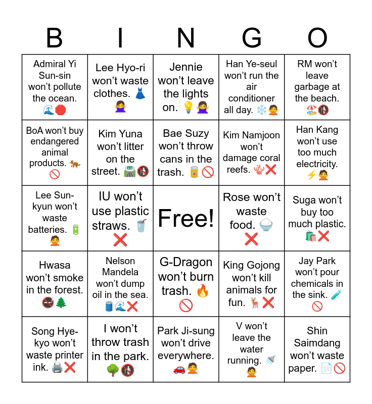 This bingo card has a free space and 30 words: I won’t throw trash in the park. 🌳🚯, King Sejong won’t waste water. 💧🙅, IU won’t use plastic straws. 🥤❌, BTS Jimin won’t cut down trees. 🌲❌, Admiral Yi Sun-sin won’t pollute the ocean. 🌊🛑, Jennie won’t leave the lights on. 💡🙅♀️, Kim Yuna won’t litter on the street. 🛣🚯, G-Dragon won’t burn trash. 🔥🚫, Rose won’t waste food. 🍚❌, Park Ji-sung won’t drive everywhere. 🚗🙅, Suga won’t buy too much plastic. 🛍❌, Shin Saimdang won’t waste paper. 📄🚫, V won’t leave the water running. 🚿🙅, Taeyeon won’t throw bottles in the river. 🍾🌊❌, Han Kang won’t use too much electricity. ⚡🙅, Jungkook won’t step on flowers. 🌸🚫, King Gojong won’t kill animals for fun. 🦌❌, Hwasa won’t smoke in the forest. 🚭🌲, Nelson Mandela won’t dump oil in the sea. 🛢🌊❌, RM won’t leave garbage at the beach. 🏖🚯, Lee Sun-kyun won’t waste batteries. 🔋🙅, Cha Eun-woo won’t throw gum on the ground. 🍬🚫, Lee Hyo-ri won’t waste clothes. 👗🙅♀️, Kim Namjoon won’t damage coral reefs. 🪸❌, BoA won’t buy endangered animal products. 🐅🚫, Han Ye-seul won’t run the air conditioner all day. ❄️🙅, Jay Park won’t pour chemicals in the sink. 🧪🚫, Song Hye-kyo won’t waste printer ink. 🖨❌, Bae Suzy won’t throw cans in the trash. 🥫🚫 and Song Joong-ki won’t harm birds’ nests. 🪺🙅.