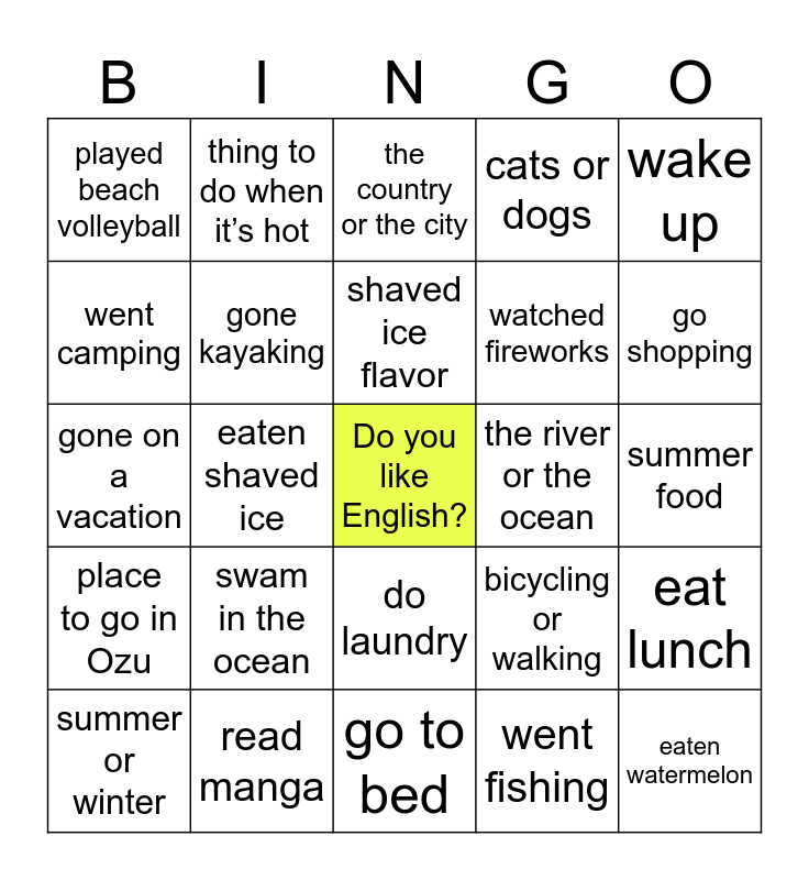 This bingo card has a free space and 24 words: swam in the ocean, read manga, shaved ice flavor, summer or winter, wake up, played beach volleyball, went camping, thing to do when it’s hot, the river or the ocean, do laundry, watched fireworks, gone on a vacation, bicycling or walking, eat lunch, gone kayaking, went fishing, summer food, the country or the city, go shopping, eaten shaved ice, eaten watermelon, place to go in Ozu, cats or dogs and go to bed.