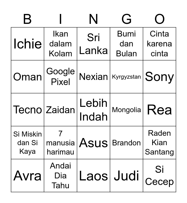 This bingo card has a free space and 24 words: 7 manusia harimau, Andai Dia Tahu, Nexian, Avra, Cinta karena cinta, Ichie, Oman, Ikan dalam Kolam, Mongolia, Asus, Kyrgyzstan, Tecno, Brandon, Raden Kian Santang, Google Pixel, Judi, Rea, Sri Lanka, Sony, Zaidan, Si Cecep, Si Miskin dan Si Kaya, Bumi dan Bulan and Laos.