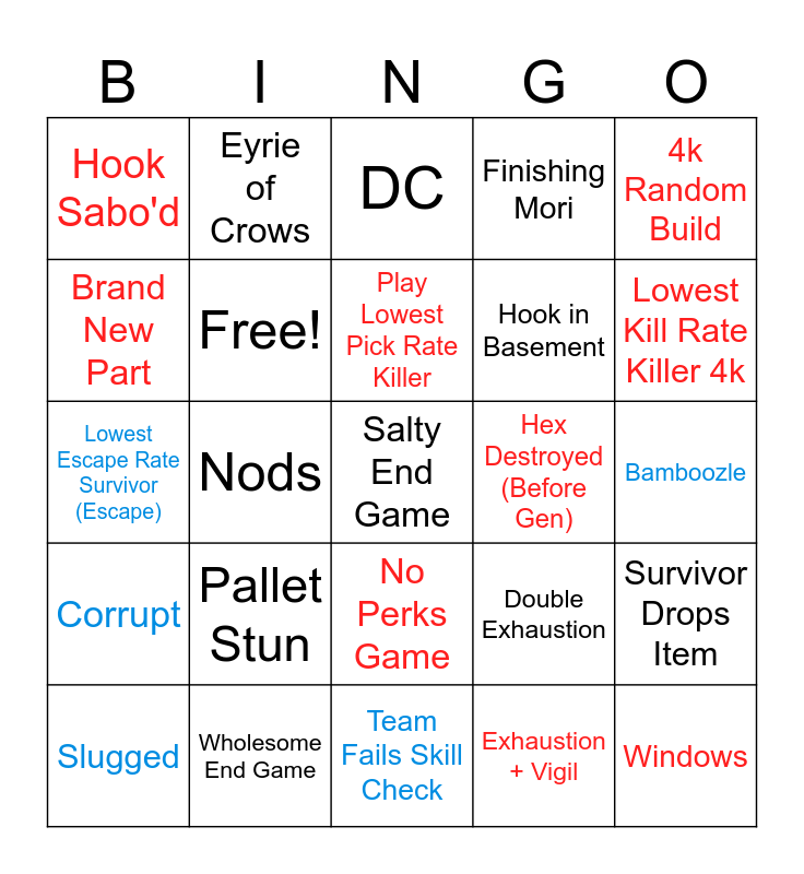 This bingo card has 83 words: E, Clown, DC, Hit on Hook, Killer Leaves Chase, TBAG, Flashlight Save, Map Offering, Tunneling, Hatch Escape, Pain Resonance, NOED, Free!, Hex Destroyed (Before Gen), Mori, Hook Sabo'd, Slugged, Brand New Part, 4k, 4 Escape, Escape With New Item, Hook in Basement, Salty End Game, Survivor Gives Up, Nods, nice killer, Finesse, Gen Rushed, P100, TTV, Pallet Stun, Stealth Killer, Sus Name, Lowest Escape Rate Survivor (Escape), Windows, 4 of a kind (same perk all survs), Team Fails Skill Check, Boon, Lowest Kill Rate Killer 4k, Corrupt, 4 Gen Perks, Walking Dead Character, Double Iri, Stealthy Survivor(s), Killer <2% Pick Rate, Fallen Refuge, Eyrie of Crows, Abandon, Anniversary Cake (Limited BP Item), Hex/Boon Name, Double Exhaustion, Finishing Mori, Bamboozle, Wesker, Grabbed (gen, locker window), Decisive Strike, Shirtless Survivor, Exposed Down, Wholesome End Game, Jim the Pole, Indoor Map, Escape Random Build, Killer Whiff, 4k Random Build, Survivor Dead Before 4 Gens, Survivor Drops Item, Interrupt Survivor on Door, Syringe, Hatch Offering, Fazbear's Pizza, Luck Offering, Lara Cosmetic, Grab Survivor in Security Door, No Perks Game, Exhaustion + Vigil, Ghoul, Friends 'til the End, Play Lowest Pick Rate Killer, Bring at least 3 of same item, Kill Obsession First, Wait in Exit Gate, No Perks Game and Fog Vial Escape.