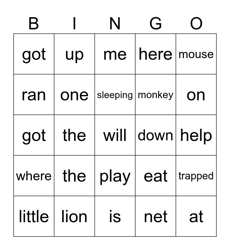 This bingo card has a free space and 24 words: the, lion, sleeping, little, mouse, got, ran, up, down, play, monkey, got, eat, trapped, one, net, help, me, on, the, at, where, here and is.