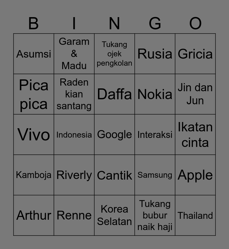 This bingo card has a free space and 24 words: Riverly, Renne, Daffa, Arthur, Gricia, Asumsi, Pica pica, Garam & Madu, Interaksi, Cantik, Nokia, Vivo, Samsung, Apple, Raden kian santang, Tukang bubur naik haji, Ikatan cinta, Tukang ojek pengkolan, Jin dan Jun, Indonesia, Thailand, Kamboja, Rusia and Korea Selatan.