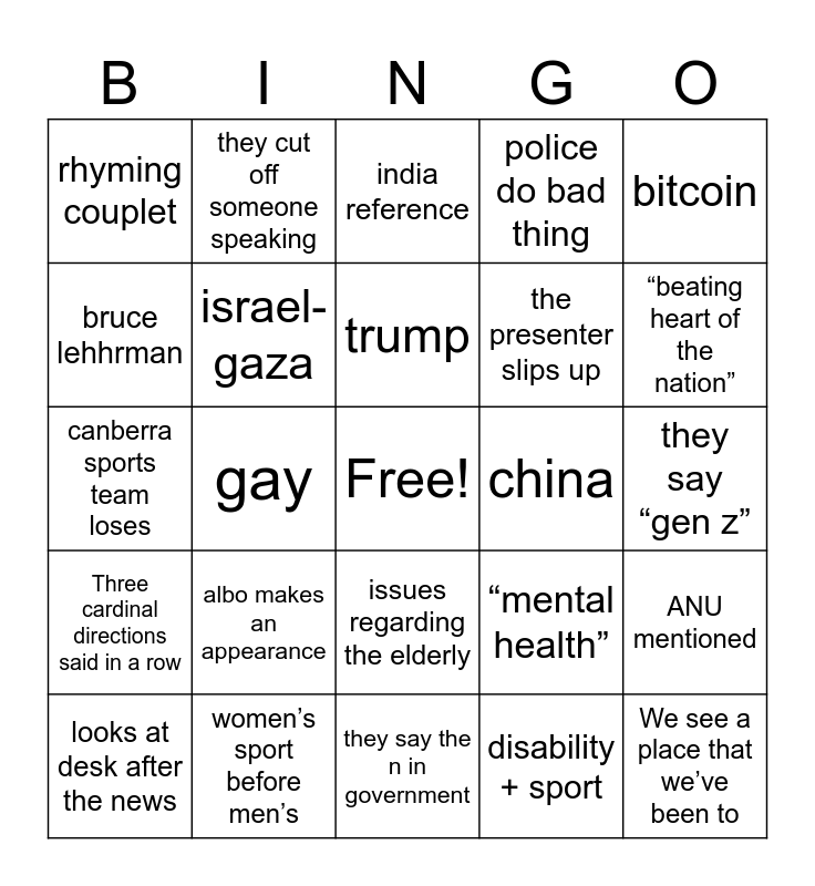 This bingo card has a free space and 32 words: disability + sport, ukraine, gay, “fighting for their life”, Three cardinal directions said in a row, israel-gaza, bitcoin, ANU mentioned, they cut off someone speaking, “back home”, trump, india reference, dead white woman, it is forecasted to rain tomorrow, china, shane rattenbury, looks at desk after the news, canberra sports team loses, issues regarding the elderly, albo makes an appearance, “mental health”, the royals mentioned, they say “gen z”, women’s sport before men’s, We see a place that we’ve been to, police do bad thing, the presenter slips up, bruce lehhrman, rhyming couplet, they say the n in government, white terrorists and “beating heart of the nation”.