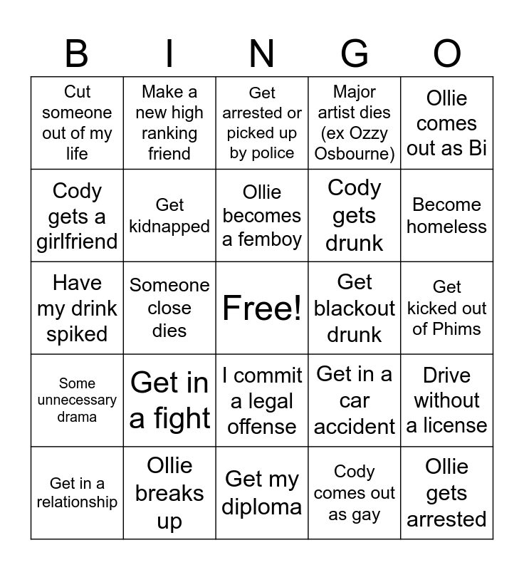This bingo card has a free space and 24 words: Get in a relationship, Get in a fight, Ollie becomes a femboy, Cody comes out as gay, Ollie comes out as Bi, Cut someone out of my life, Make a new high ranking friend, Get arrested or picked up by police, Get blackout drunk, Get kicked out of Phims, Have my drink spiked, Get kidnapped, Get in a car accident, Drive without a license, Cody gets a girlfriend, Ollie breaks up, Get my diploma, Major artist dies (ex Ozzy Osbourne), Become homeless, Some unnecessary drama, Someone close dies, I commit a legal offense, Cody gets drunk and Ollie gets arrested.