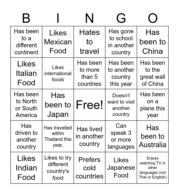 This bingo card has a free space and 24 words: Has travelled within Thailand this year., Likes to try different country's food, Has been to more than 5 countries, Likes Indian Food, Has been to China, Has been to a different continent, Likes Italian Food, Likes Mexican Food, Doesn't want to visit another country, Has lived in another country, Has been to another country this year, Has been to North or South America, Can speak 3 or more languages, Has been to Australia, Likes international foods, Likes Japanese Food, Has been on a plane this year, Hates to travel, Has been to the great wall of China, Has been to Japan, Enjoys watching TV in other languages (not Thai or English), Has driven to another country, Has gone to school in another country and Prefers cold countries.