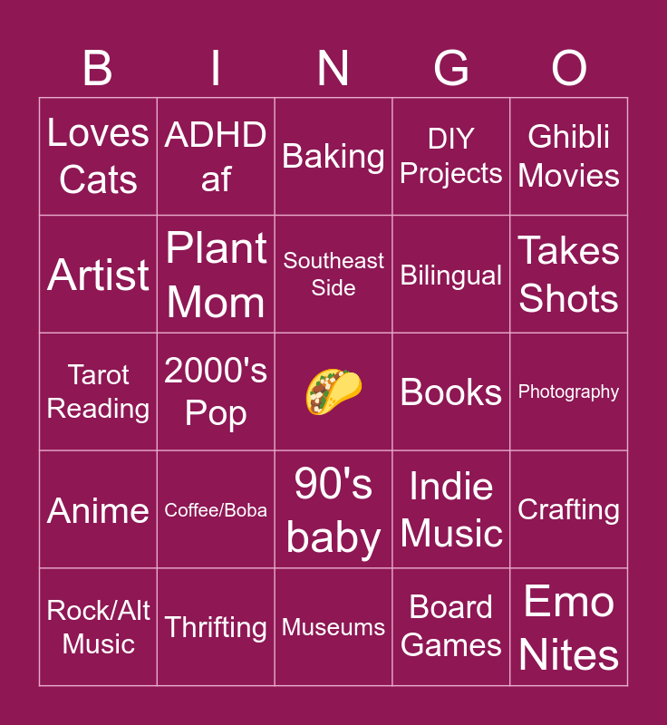 This bingo card has a free space and 24 words: Coffee/Boba, Thrifting, Southeast Side, Rock/Alt Music, Ghibli Movies, Loves Cats, Artist, ADHD af, Books, 90's baby, Bilingual, Tarot Reading, Indie Music, Crafting, Plant Mom, Board Games, Photography, Baking, Takes Shots, 2000's Pop, Emo Nites, Anime, DIY Projects and Museums.