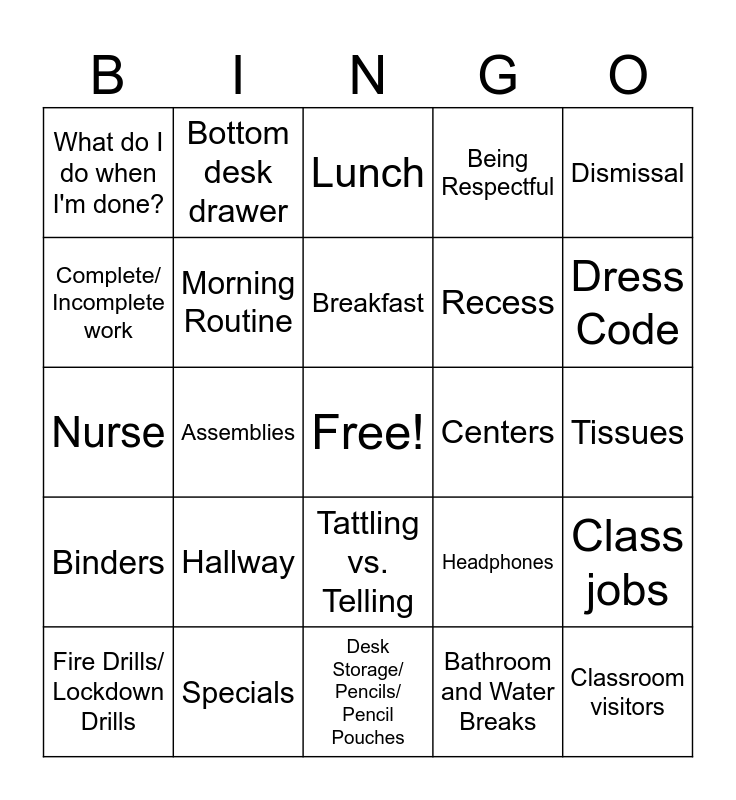 This bingo card has a free space and 24 words: Hallway, Specials, Breakfast, Fire Drills/ Lockdown Drills, Dismissal, What do I do when I'm done?, Complete/ Incomplete work, Bottom desk drawer, Centers, Tattling vs. Telling, Recess, Nurse, Headphones, Class jobs, Morning Routine, Bathroom and Water Breaks, Tissues, Lunch, Dress Code, Assemblies, Classroom visitors, Binders, Being Respectful and Desk Storage/ Pencils/ Pencil Pouches.