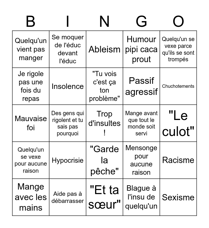This bingo card has a free space and 42 words: Gaspillage allimentaire, "Tu vois c'est ça ton problème", Qqch qui donne envie de vomir, Hypocrisie, Blague à l'insu de quelqu'un, Racisme, Sexisme, Homophobie, Ableism, "Garde la pêche", "Le culot", Chuchotements, Des gens qui rigolent et tu sais pas pourquoi, Quelqu'un se vexe parce qu'ils se sont trompés, Quelqu'un qui cri pour aucune raison, Mensonge pour aucune raison, Téléphone à table, Mauvaise foi, L'éduc qui s'agace, Se moquer de l'éduc devant l'éduc, Je rigole pas une fois du repas, "Blague" sur les gitans, Quelqu'un quitte la table, Quelqu'un vient pas manger, J'essaye de participer et je me fais renvoyer, La mère de Kelly, Passif agressif, Quelqu'un dit qqch, pas de problème, Quelqu'un dit la même chose, problème, La blague trop drôle de faire semblant de passer qqch, "Tiépamenteur", Référence sexuelle, Quelqu'un se vexe pour aucune raison, Insolence, "Et ta sœur", Balance sur les chaises, Mange avec les mains, Aide pas à débarrasser, Mange avant que tout le monde soit servi, Confrontation inutile, Reste beaucoup trop longtemps sur qqch, Humour pipi caca prout and Je passe un repas au délà de 3/10.