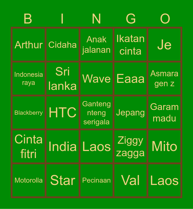 This bingo card has 26 words: Laos, Val, Wave, Star, Je, Arthur, Indonesia raya, Cidaha, Garam madu, Ziggy zagga, Eaaa, Blackberry, Mito, Motorolla, HTC, Nokia, Ikatan cinta, Cinta fitri, Anak jalanan, Ganteng nteng serigala, Asmara gen z, Pecinaan, Jepang, India, Sri lanka and Laos.