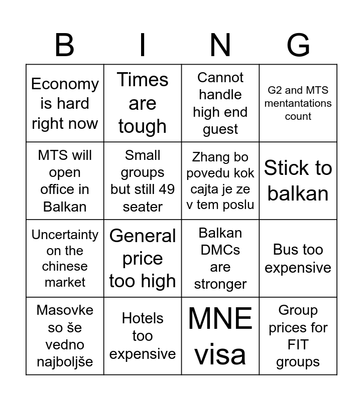 This bingo card has 16 words: Hotels too expensive, Bus too expensive, Cannot handle high end guest, Economy is hard right now, Uncertainty on the chinese market, Times are tough, Balkan DMCs are stronger, MNE visa, MTS will open office in Balkan, Small groups but still 49 seater, Masovke so še vedno najboljše, G2 and MTS mentantations count, General price too high, Stick to balkan, Zhang bo povedu kok cajta je ze v tem poslu and Group prices for FIT groups.