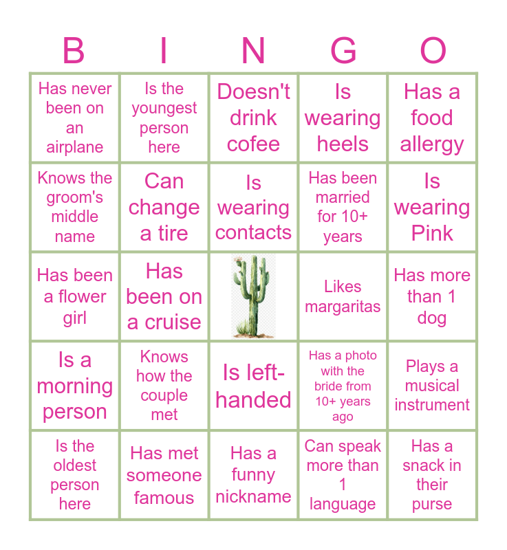 This bingo card has a free space and 24 words: Knows how the couple met, Has met someone famous, Is wearing contacts, Is the oldest person here, Has a food allergy, Has never been on an airplane, Knows the groom's middle name, Is the youngest person here, Likes margaritas, Is left-handed, Has been married for 10+ years, Has been a flower girl, Has a photo with the bride from 10+ years ago, Plays a musical instrument, Can change a tire, Can speak more than 1 language, Has more than 1 dog, Doesn't drink cofee, Is wearing Pink, Has been on a cruise, Has a snack in their purse, Is a morning person, Is wearing heels and Has a funny nickname.