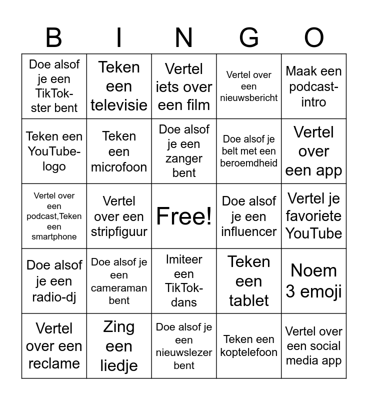 This bingo card has a free space and 24 words: Doe alsof je een cameraman bent, Zing een liedje, Doe alsof je een zanger bent, Vertel over een reclame, Maak een podcast-intro, Doe alsof je een TikTok-ster bent, Teken een YouTube-logo, Teken een televisie, Doe alsof je een influencer, Imiteer een TikTok-dans, Doe alsof je belt met een beroemdheid, Vertel over een podcast,Teken een smartphone, Teken een tablet, Noem 3 emoji, Teken een microfoon, Teken een koptelefoon, Vertel je favoriete YouTube, Vertel iets over een film, Vertel over een app, Vertel over een stripfiguur, Vertel over een social media app, Doe alsof je een radio-dj, Vertel over een nieuwsbericht and Doe alsof je een nieuwslezer bent.