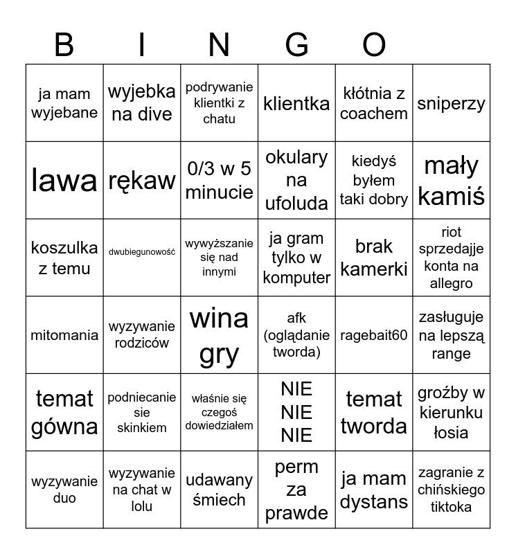 This bingo card has 36 words: NIE NIE NIE, właśnie się czegoś dowiedziałem, perm za prawde, lawa, mitomania, ja gram tylko w komputer, rękaw, udawany śmiech, kłótnia z coachem, temat tworda, mały kamiś, klientka, groźby w kierunku łosia, dwubiegunowość, okulary na ufoluda, ja mam wyjebane, temat gówna, brak kamerki, koszulka z temu, podrywanie klientki z chatu, wywyższanie się nad innymi, wyzywanie rodziców, afk (oglądanie tworda), wina gry, ragebait60, wyjebka na dive, kiedyś byłem taki dobry, wyzywanie na chat w lolu, 0/3 w 5 minucie, sniperzy, zagranie z chińskiego tiktoka, wyzywanie duo, zasługuje na lepszą range, riot sprzedajje konta na allegro, podniecanie sie skinkiem and ja mam dystans.