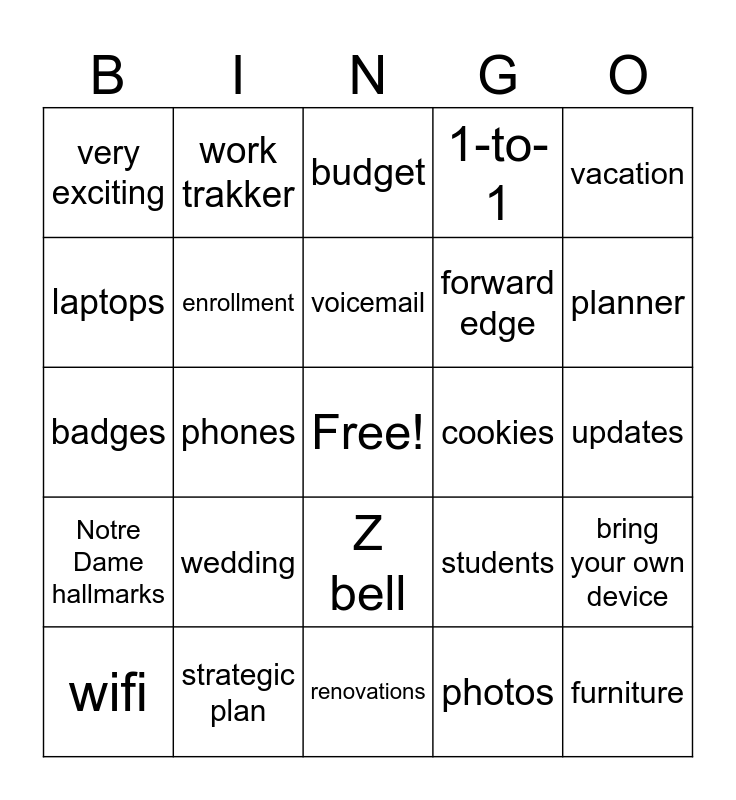 This bingo card has a free space and 30 words: strategic plan, printers, phones, Raptor, very exciting, budget, enrollment, Z bell, cookies, renovations, updates, furniture, photos, survey, planner, parents, students, Notre Dame hallmarks, wedding, vacation, badges, playground, work trakker, forward edge, laptops, 1-to-1, bring your own device, wifi, voicemail and Silver Knight.