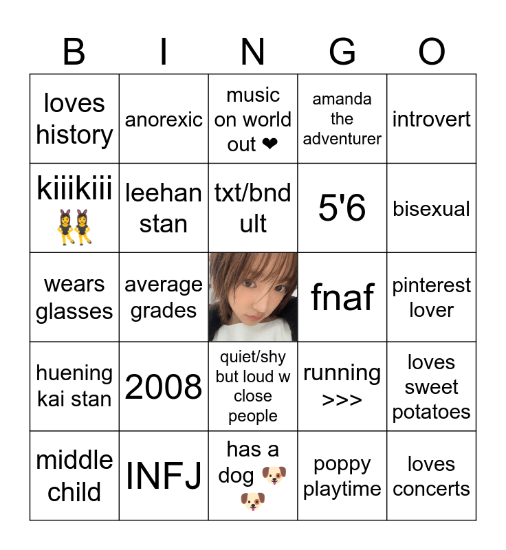 This bingo card has a free space and 24 words: 2008, INFJ, txt/bnd ult, middle child, introvert, loves history, kiiikiii π―ββοΈ, anorexic, fnaf, quiet/shy but loud w close people, 5'6, wears glasses, running >>>, loves sweet potatoes, leehan stan, poppy playtime, pinterest lover, music on world out β€, bisexual, average grades, loves concerts, huening kai stan, amanda the adventurer and has a dog πΆπΆ.