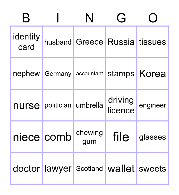 This bingo card has 30 words: lawyer, businesswoman, politician, actress, identity card, Greece, Germany, chewing gum, driving licence, Scotland, engineer, umbrella, wallet, sweets, Korea, hairdresser, file, niece, comb, tissues, nurse, waiter, husband, stamps, nephew, Russia, glasses, doctor, accountant and Ireland.