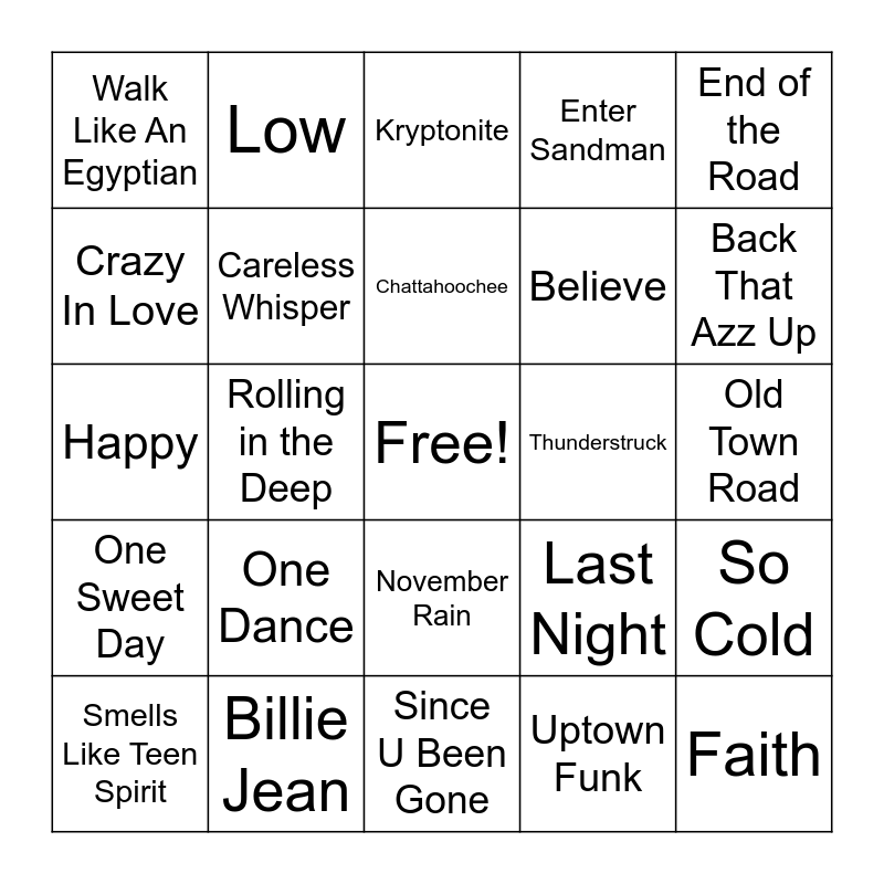 This bingo card has a free space and 60 words: Remedy, Billie Jean, Like A Virgin, One Sweet Day, Uptown Funk, Shape of You, Careless Whisper, Macarena, Believe, Smooth, Enter Sandman, Higher, Crazy In Love, Yeah!, Blinding Lights, Walk Like An Egyptian, Faith, End of the Road, I Will Always Love You, Chattahoochee, Thunderstruck, Kryptonite, Smells Like Teen Spirit, So Cold, The Sign, Gangsta's Paradise, Hypnotize, I Want It That Way, Back That Azz Up, Forgot About Dre, Hanging By A Moment, In Da Club, How You Remind Me, Bad Day, Low, Boom Boom Pow, TiK ToK, Rolling in the Deep, Thrift Shop, Happy, Not Like Us, One Dance, Old Town Road, Levitating, Last Night, A Bar Song, Everlong, Shine, Bohemian Rhapsody, November Rain, Since U Been Gone, Hey Ya!, Look Away, Hold On, Too Close, Breathe, Irreplaceable, Low, Somebody That I Used to Know and …Baby One More Time.