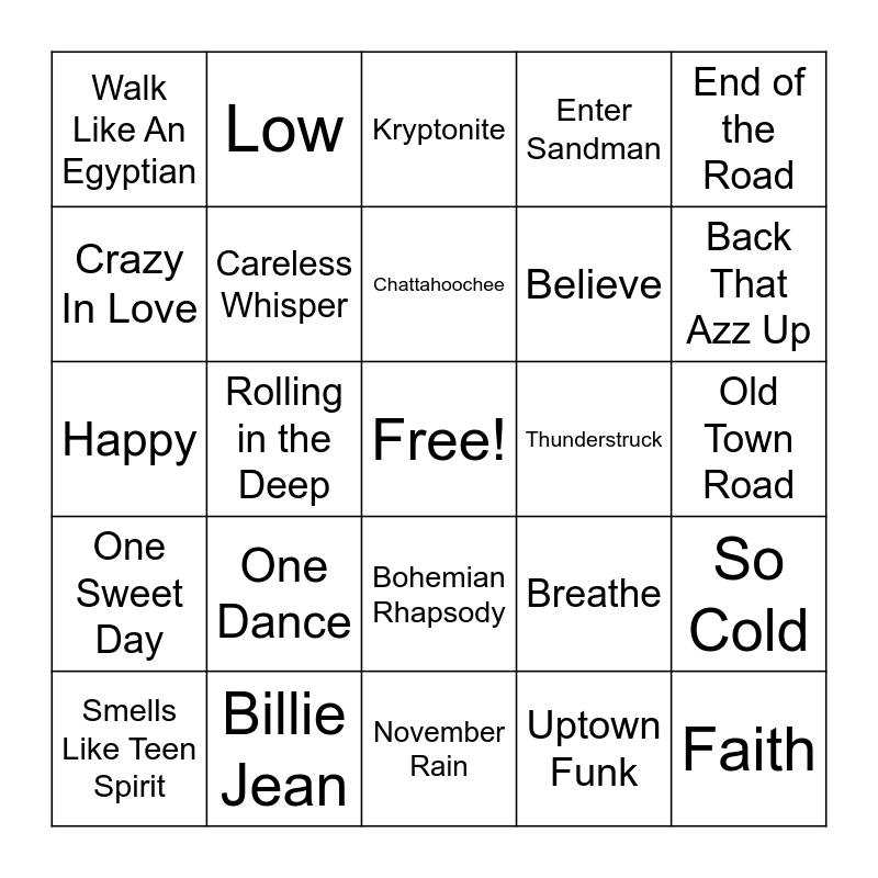 This bingo card has a free space and 59 words: Remedy, Billie Jean, Like A Virgin, One Sweet Day, Uptown Funk, Shape of You, Careless Whisper, Macarena, Believe, Smooth, Enter Sandman, Higher, Crazy In Love, Yeah!, Blinding Lights, Walk Like An Egyptian, Faith, End of the Road, I Will Always Love You, Chattahoochee, Thunderstruck, Kryptonite, Smells Like Teen Spirit, So Cold, The Sign, Gangsta's Paradise, Hypnotize, I Want It That Way, Back That Azz Up, Forgot About Dre, Hanging By A Moment, In Da Club, How You Remind Me, Bad Day, Low, Boom Boom Pow, TiK ToK, Rolling in the Deep, Thrift Shop, Happy, Not Like Us, One Dance, Old Town Road, Levitating, Last Night, A Bar Song, Everlong, Shine, Bohemian Rhapsody, November Rain, Since U Been Gone, Hey Ya!, Look Away, Hold On, Too Close, Breathe, Irreplaceable, Somebody That I Used to Know and …Baby One More Time.