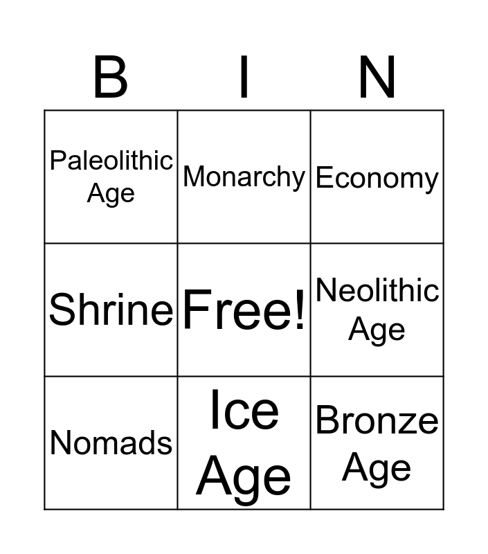 This bingo card has a free space and 8 words: Neolithic Age, Economy, Monarchy, Nomads, Paleolithic Age, Bronze Age, Shrine and Ice Age.