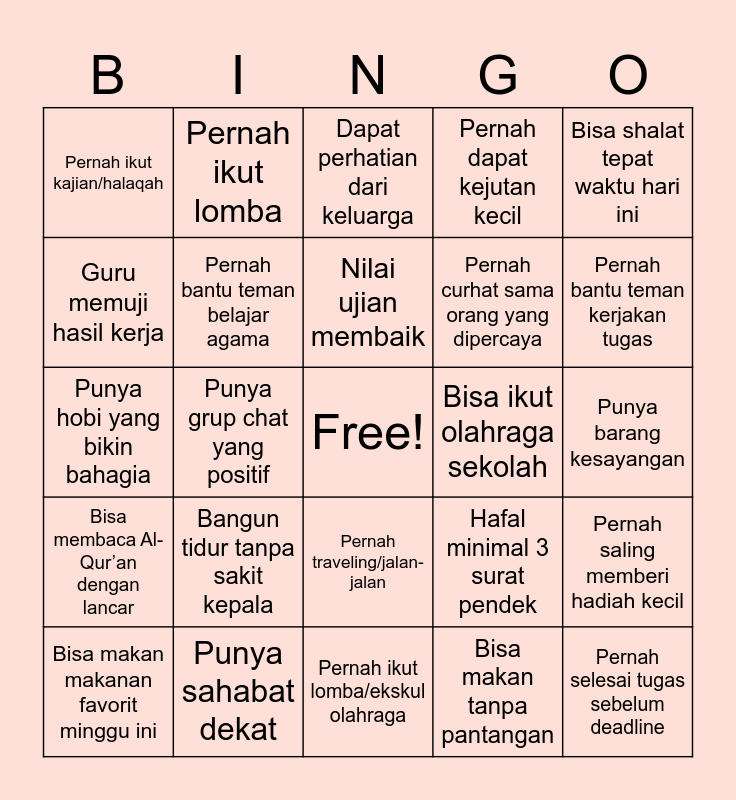 This bingo card has a free space and 24 words: Bangun tidur tanpa sakit kepala, Punya sahabat dekat, Nilai ujian membaik, Bisa makan makanan favorit minggu ini, Bisa shalat tepat waktu hari ini, Pernah ikut kajian/halaqah, Guru memuji hasil kerja, Pernah ikut lomba, Bisa ikut olahraga sekolah, Pernah traveling/jalan-jalan, Pernah curhat sama orang yang dipercaya, Punya hobi yang bikin bahagia, Hafal minimal 3 surat pendek, Pernah saling memberi hadiah kecil, Pernah bantu teman belajar agama, Bisa makan tanpa pantangan, Punya barang kesayangan, Dapat perhatian dari keluarga, Pernah bantu teman kerjakan tugas, Punya grup chat yang positif, Pernah selesai tugas sebelum deadline, Bisa membaca Al-Qur’an dengan lancar, Pernah dapat kejutan kecil and Pernah ikut lomba/ekskul olahraga.