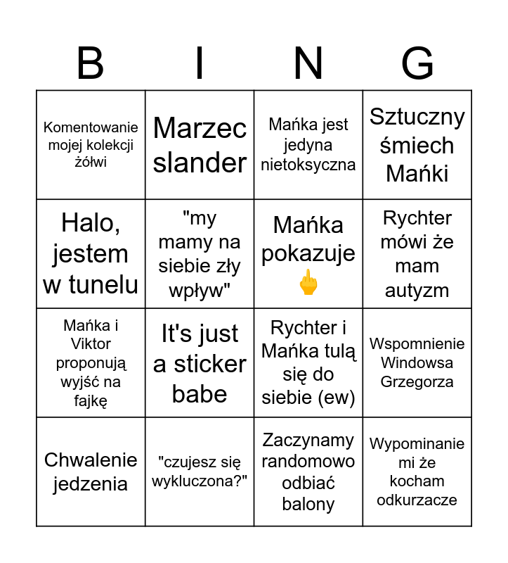 This bingo card has 16 words: "czujesz się wykluczona?", Wspomnienie Windowsa Grzegorza, Mańka jest jedyna nietoksyczna, Komentowanie mojej kolekcji żółwi, Mańka i Viktor proponują wyjść na fajkę, Marzec slander, Rychter i Mańka tulą się do siebie (ew), Zaczynamy randomowo odbiać balony, Halo, jestem w tunelu, "my mamy na siebie zły wpływ", Chwalenie jedzenia, Sztuczny śmiech Mańki, It's just a sticker babe, Rychter mówi że mam autyzm, Mańka pokazuje 🖕 and Wypominanie mi że kocham odkurzacze.
