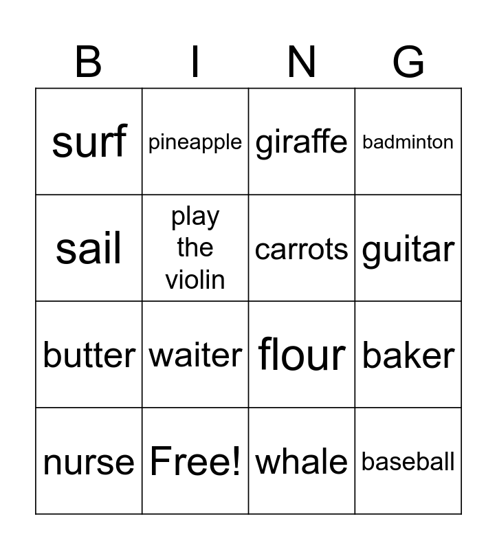 This bingo card has 25 words: helmet, watch, guitar, armchair, sail, surf, play the violin, pineapple, Free!, olive oil, butter, flour, sugar, chocolate, carrots, hippo, whale, giraffe, waiter, baker, nurse, mechanic, baseball, badminton and vegetables.