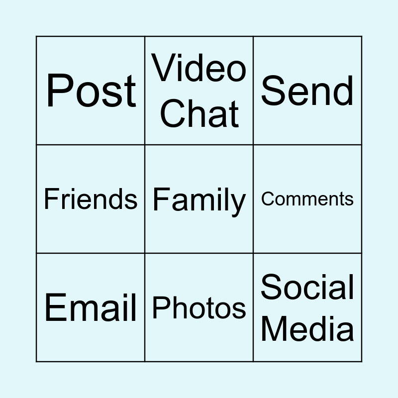 This bingo card has a free space and 13 words: Card, Letter, Email, Video Chat, Friends, Social Media, Instagram, Facebook, Photos, Post, Comments, Send and Videos.