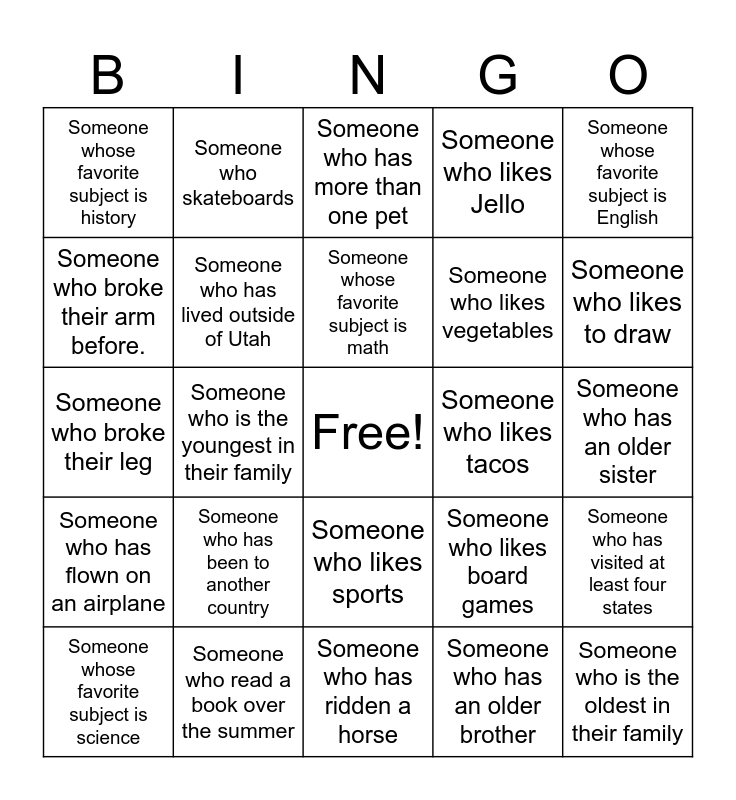 This bingo card has a free space and 24 words: Someone who has been to another country, Someone who read a book over the summer, Someone whose favorite subject is math, Someone whose favorite subject is science, Someone whose favorite subject is English, Someone whose favorite subject is history, Someone who broke their arm before., Someone who skateboards, Someone who likes tacos, Someone who likes sports, Someone who likes vegetables, Someone who broke their leg, Someone who likes board games, Someone who has visited at least four states, Someone who has lived outside of Utah, Someone who has an older brother, Someone who has an older sister, Someone who has more than one pet, Someone who likes to draw, Someone who is the youngest in their family, Someone who is the oldest in their family, Someone who has flown on an airplane, Someone who likes Jello and Someone who has ridden a horse.