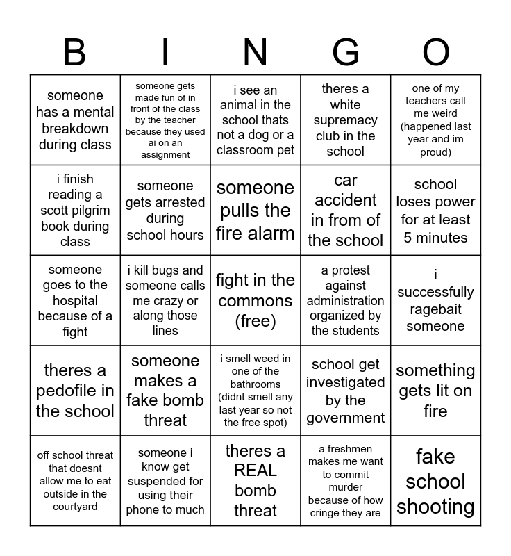 This bingo card has a free space and 24 words: someone makes a fake bomb threat, someone i know get suspended for using their phone to much, someone pulls the fire alarm, off school threat that doesnt allow me to eat outside in the courtyard, one of my teachers call me weird (happened last year and im proud), someone has a mental breakdown during class, i finish reading a scott pilgrim book during class, someone gets made fun of in front of the class by the teacher because they used ai on an assignment, a protest against administration organized by the students, i smell weed in one of the bathrooms (didnt smell any last year so not the free spot), car accident in from of the school, someone goes to the hospital because of a fight, school get investigated by the government, something gets lit on fire, someone gets arrested during school hours, a freshmen makes me want to commit murder because of how cringe they are, i successfully ragebait someone, i see an animal in the school thats not a dog or a classroom pet, school loses power for at least 5 minutes, i kill bugs and someone calls me crazy or along those lines, fake school shooting, theres a pedofile in the school, theres a white supremacy club in the school and theres a REAL bomb threat.