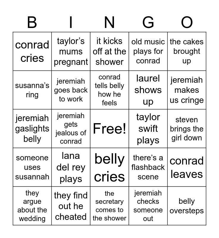This bingo card has a free space and 24 words: lana del rey plays, they find out he cheated, conrad tells belly how he feels, they argue about the wedding, the cakes brought up, conrad cries, susanna’s ring, taylor’s mums pregnant, taylor swift plays, belly cries, laurel shows up, jeremiah gaslights belly, there’s a flashback scene, conrad leaves, jeremiah goes back to work, jeremiah checks someone out, steven brings the girl down, it kicks off at the shower, jeremiah makes us cringe, jeremiah gets jealous of conrad, belly oversteps, someone uses susannah, old music plays for conrad and the secretary comes to the shower.