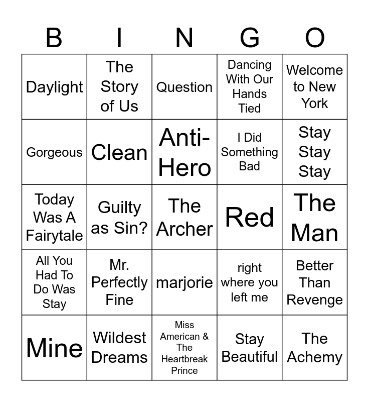 This bingo card has 33 words: The Achemy, Fresh Out the Slammer, Guilty as Sin?, So High School, All You Had To Do Was Stay, Clean, Welcome to New York, Mine, The Story of Us, Hits Different, Anti-Hero, Question, Everything Has Changed, I Almost Do, Red, Stay Stay Stay, Wildest Dreams, Today Was A Fairytale, Mr. Perfectly Fine, right where you left me, marjorie, my tears ricochet, Daylight, The Man, Miss American & The Heartbreak Prince, The Archer, Dancing With Our Hands Tied, I Did Something Bad, Gorgeous, Better Than Revenge, Mary's Song (Oh My My My), Stay Beautiful and august.