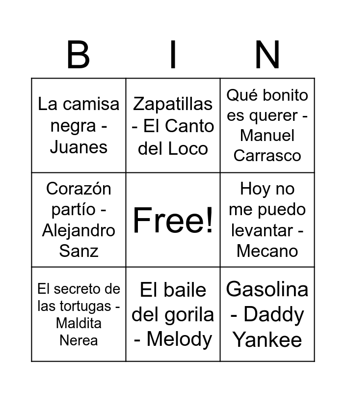 This bingo card has a free space and 95 words: La gasolina, Ave Maria, DANZA CODURO, La mayonesa, Paquito el chocolatero, Dale don dale, Pasarela, Llamado de emergencia, El tiburón, Waka Waka - Shakira, Macarena - Los del Río, Despacito - Luis Fonsi, Torero - Chayanne, El baile del gorila - Melody, Caminando por la vida - Melendi, La camisa negra - Juanes, Cuando zarpa el amor - Camela, Gangnamstyle - PSY, Ave María - David Bisbal, Besos - El Canto del Loco, Aserejé - Las Ketchup, Bomba - King África, Por la raja de tu falda - Estopa, La Flaca - Jarabe de Palo, Corazón partío - Alejandro Sanz, Hoy no me puedo levantar - Mecano, Mi gran noche - Raphael, Cuando tú vas - Chenoa, Que la detengan - David Civera, A quién le importa - Alaska y Dinarama, 19 días y 500 noches - Sabina, No puedo vivir sin ti - Los Ronaldos, La chica ye-yé - Concha Velasco, Colgando en tus manos - Carlos Baute, Antes muerta que sencilla - María Isabel, Dos hombres y un destino - Bustamante, Son de amores - Andy y Lucas, Tenía tanto que darte - Nena Daconte, Búscate un hombre que te quiera - El Arrebato, El Run Run - Rosario Flores, Esta soy yo - El sueño de Morfeo, Todos los días sale el sol - Bongo Botrako, Mala Mujer - C. Tangana, Gasolina - Daddy Yankee, Como una ola - Rocío Jurado, Mi carro - Manolo Escobar, Volando voy - Camarón de la Isla, Devuélveme a mi chica - Hombres G, La Puerta de Alcalá - Ana Belén y Víctor Manuel, Mediterráneo - Serrat, Tómbola - Marisol, Eva María - Fórmula V, Bailando - Enrique Iglesias, Color esperanza - Diego Torres, La casa por el tejado - Fito y Fitipaldis, Nada fue un error - Coti, Por quererte - Efecto Mariposa, Sarandonga - Lolita Flores, Pedro - Raffaella Carra, Cien gaviotas - Duncan Dhu, El secreto de las tortugas - Maldita Nerea, Obsesión - Aventura, Bonito - Jarabe de Palo, Pan y mantequilla - Efecto pasillo, Cuando me siento bien - Efecto pasillo, La Lola - Café Quijano, Amante Bandido - Miguel Bosé, Antes que ver el sol - Coti, Qué bonito es querer - Manuel Carrasco, Mi persona favorita - Alejandro Sanz, La bicicleta - Carlos Vives y Shakira, Baila morena - Zucchero, En qué estrella estará - Nena Daconte, Gasolina, sangre y fuego - Haze, Princesas - Pereza, Contando lunares - Don Patricio y Cruz Cafuné, Malamente - Rosalía, Con altura - Rosalía, La madre de Jose - El Canto del Loco, Zapatillas - El Canto del Loco, Estrella Polar - Pereza, Bien Duro - C. Tangana, Resistiré - Dúo Dinámico, Corazón contento - Marisol, La, La, La - Massiel, Baila el Chiki Chiki - Chikilicuatre, Gol - Cali y El Dandee, Y nos dieron las diez - Sabina, Hijo de la luna - Mecano, Hay que venir al sur - Raffaella Carrá, La primavera trompetera - Los Delinquentes, Me colé en una fiesta - Mecano, Un rayo de sol - Los Diablos, Yo quiero bailar - Sonia y Selena and Vacaciones de verano - Fórmula.