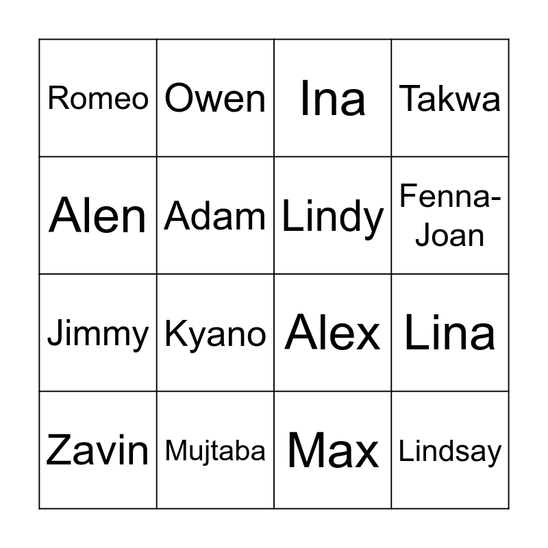 This bingo card has 16 words: Mujtaba, Lina, Ina, Romeo, Jimmy, Owen, Alex, Max, Alen, Adam, Zavin, Takwa, Kyano, Fenna-Joan, Lindy and Lindsay.