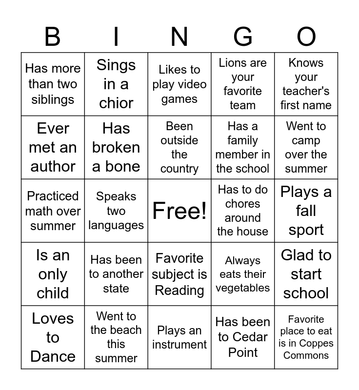This bingo card has a free space and 29 words: Loves to Dance, Likes to read, Speaks two languages, Read more than two books over the summer, Has more than two siblings, Likes to play video games, Has broken a bone, Has been to another state, Has to do chores around the house, Went to the beach this summer, Plays a fall sport, Favorite place to eat is in Coppes Commons, Plays an instrument, Has been to Cedar Point, Went to camp over the summer, Favorite subject is Math, Favorite subject is Reading, Is an only child, Knows your teacher's first name, Practiced math over summer, Always eats their vegetables, Prefers dogs over cats, Has a family member in the school, Ever met an author, Lions are your favorite team, Sings in a chior, Glad to start school, Been outside the country and Like to play sports.