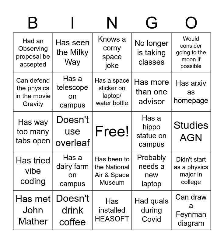 This bingo card has a free space and 29 words: Has met John Mather, Traveled this summer for a conference, Doesn't use overleaf, Has proposed to JWST, Had an Observing proposal be accepted, Knows a corny space joke, Has a telescope on campus, Has a dairy farm on campus, Has a hippo statue on campus, Doesn't drink coffee, Studies AGN, Can draw a Feynman diagram, Has installed HEASOFT, Had quals during Covid, Has arxiv as homepage, Has been to NASA Goddard, Has been to the National Air & Space Museum, Has tried vibe coding, Would consider going to the moon if possible, Has way too many tabs open, Probably needs a new laptop, Can recite the first 10 digits of Pi, Has more than one advisor, Can defend the physics in the movie Gravity, No longer is taking classes, Has seen the Milky Way, Didn't start as a physics major in college, Has a space sticker on laptop/ water bottle and Drinks way too much coffee.
