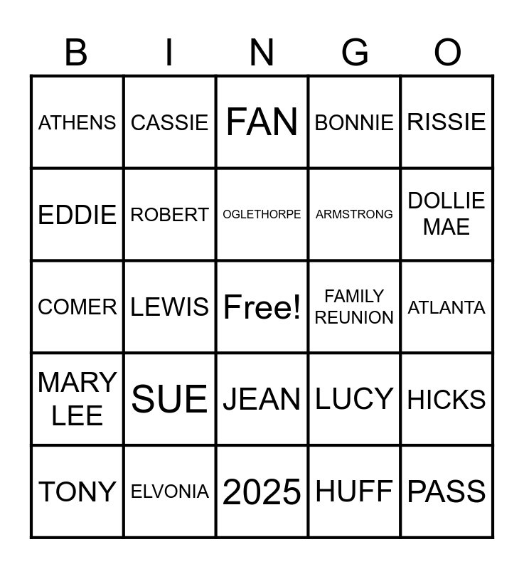 This bingo card has a free space and 24 words: TONY, SUE, OGLETHORPE, HUFF, RISSIE, ATHENS, CASSIE, FAN, FAMILY REUNION, ATLANTA, COMER, ROBERT, LUCY, HICKS, EDDIE, ELVONIA, 2025, BONNIE, DOLLIE MAE, MARY LEE, LEWIS, JEAN, ARMSTRONG and PASS.