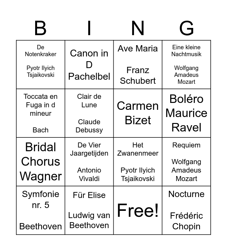 This bingo card has 17 words: Free!, Symfonie nr. 5 Beethoven, Ave Maria Franz Schubert, De Notenkraker Pyotr Ilyich Tsjaikovski, De Vier Jaargetijden Antonio Vivaldi, Eine kleine Nachtmusik Wolfgang Amadeus Mozart, Requiem Wolfgang Amadeus Mozart, Carmen Bizet, Boléro Maurice Ravel, Clair de Lune Claude Debussy, Für Elise Ludwig van Beethoven, Het Zwanenmeer Pyotr Ilyich Tsjaikovski, Toccata en Fuga in d mineur Bach, Canon in D Pachelbel, Bridal Chorus Wagner, Nessun Dorma Puccini and Nocturne Frédéric Chopin.