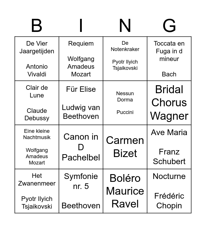 This bingo card has 16 words: Symfonie nr. 5 Beethoven, Ave Maria Franz Schubert, De Notenkraker Pyotr Ilyich Tsjaikovski, De Vier Jaargetijden Antonio Vivaldi, Eine kleine Nachtmusik Wolfgang Amadeus Mozart, Requiem Wolfgang Amadeus Mozart, Carmen Bizet, Boléro Maurice Ravel, Clair de Lune Claude Debussy, Für Elise Ludwig van Beethoven, Het Zwanenmeer Pyotr Ilyich Tsjaikovski, Toccata en Fuga in d mineur Bach, Canon in D Pachelbel, Bridal Chorus Wagner, Nessun Dorma Puccini and Nocturne Frédéric Chopin.