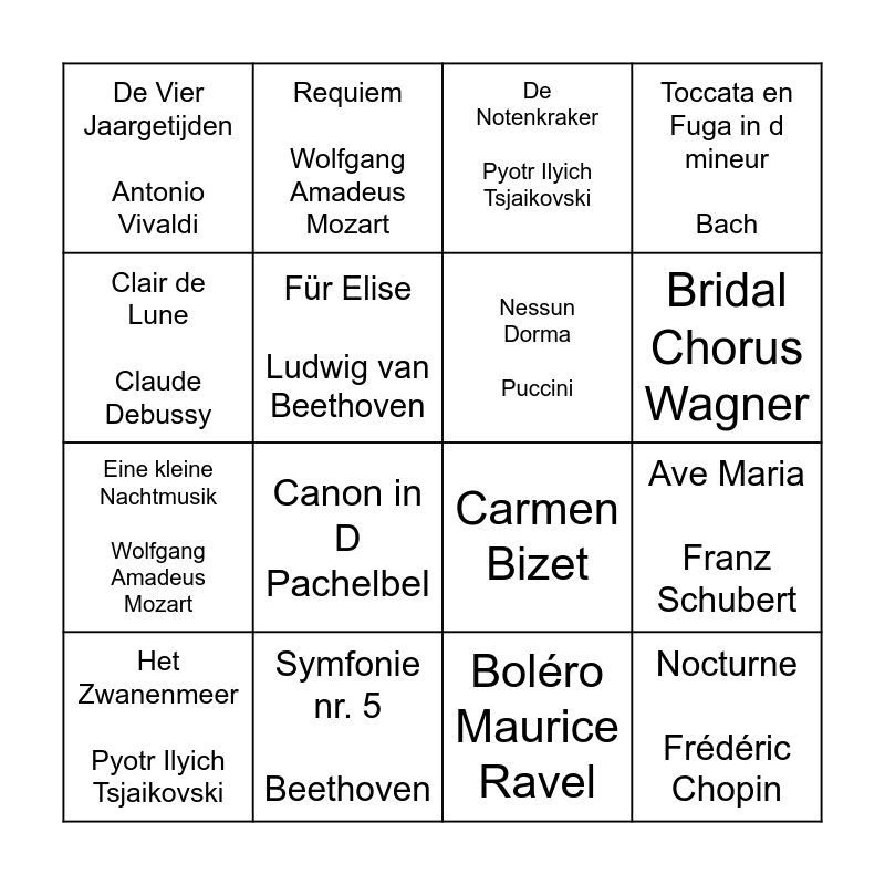 This bingo card has 16 words: Symfonie nr. 5 Beethoven, Ave Maria Franz Schubert, De Notenkraker Pyotr Ilyich Tsjaikovski, De Vier Jaargetijden Antonio Vivaldi, Eine kleine Nachtmusik Wolfgang Amadeus Mozart, Requiem Wolfgang Amadeus Mozart, Carmen Bizet, Boléro Maurice Ravel, Clair de Lune Claude Debussy, Für Elise Ludwig van Beethoven, Het Zwanenmeer Pyotr Ilyich Tsjaikovski, Toccata en Fuga in d mineur Bach, Canon in D Pachelbel, Bridal Chorus Wagner, Nessun Dorma Puccini and Nocturne Frédéric Chopin.