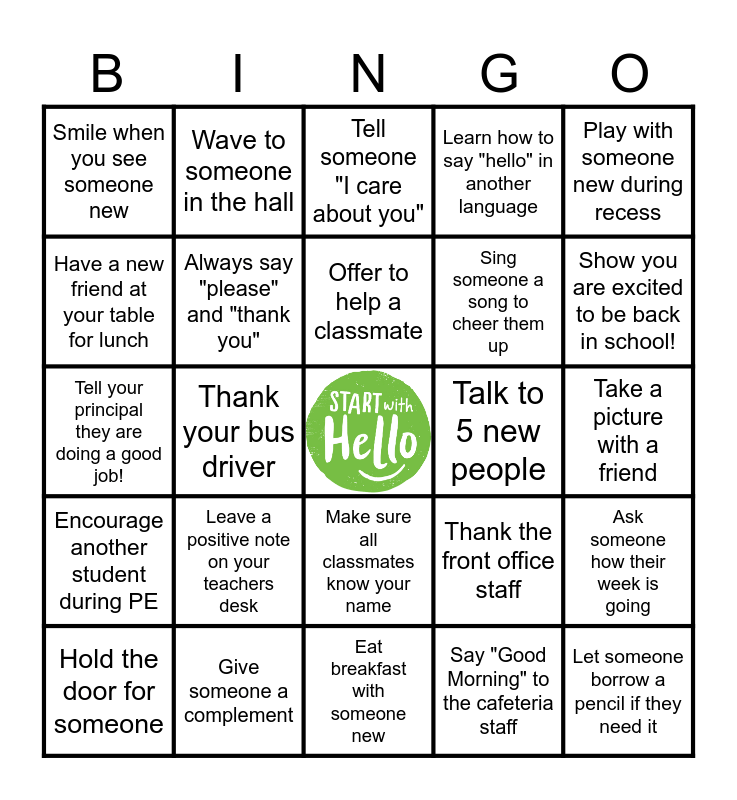 This bingo card has a free space and 24 words: Leave a positive note on your teachers desk, Give someone a complement, Offer to help a classmate, Hold the door for someone, Play with someone new during recess, Smile when you see someone new, Have a new friend at your table for lunch, Wave to someone in the hall, Talk to 5 new people, Make sure all classmates know your name, Sing someone a song to cheer them up, Tell your principal they are doing a good job!, Thank the front office staff, Ask someone how their week is going, Always say "please" and "thank you", Say "Good Morning" to the cafeteria staff, Take a picture with a friend, Tell someone "I care about you", Show you are excited to be back in school!, Thank your bus driver, Let someone borrow a pencil if they need it, Encourage another student during PE, Learn how to say "hello" in another language and Eat breakfast with someone new.