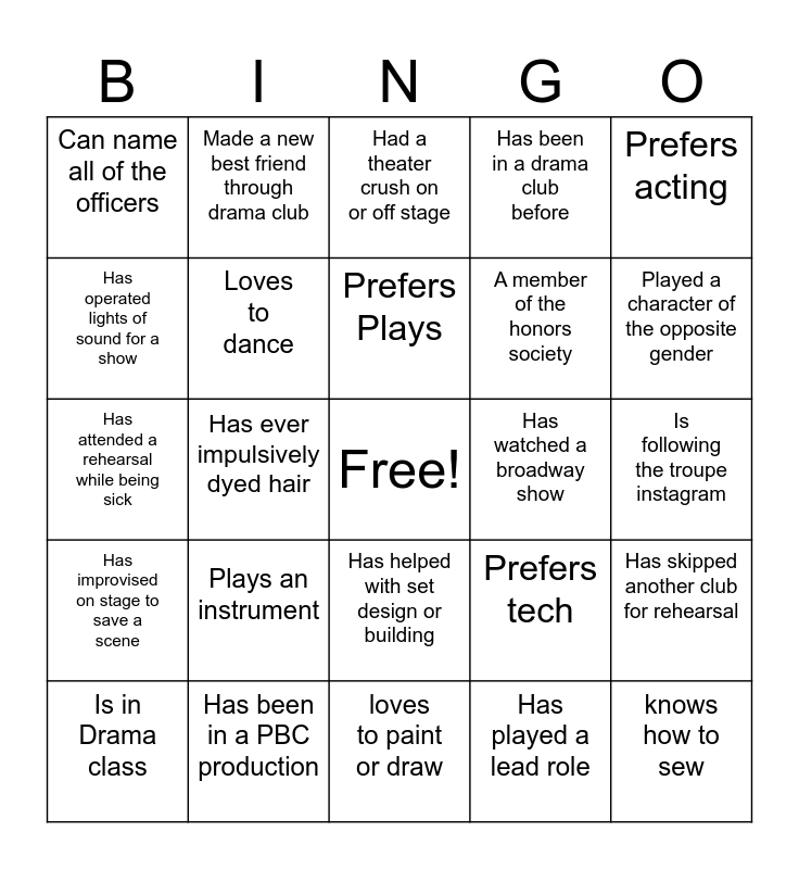 This bingo card has a free space and 24 words: Plays an instrument, Has been in a PBC production, Prefers Plays, Is in Drama class, Prefers acting, Can name all of the officers, Has operated lights of sound for a show, Made a new best friend through drama club, Has watched a broadway show, Has helped with set design or building, A member of the honors society, Has attended a rehearsal while being sick, Prefers tech, Has skipped another club for rehearsal, Loves to dance, Has played a lead role, Is following the troupe instagram, Had a theater crush on or off stage, Played a character of the opposite gender, Has ever impulsively dyed hair, knows how to sew, Has improvised on stage to save a scene, Has been in a drama club before and loves to paint or draw.